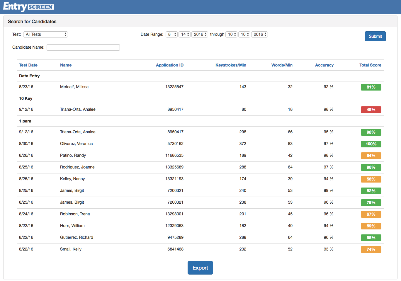 EntryScreen allows you to compare applicants against each other based on the date they took the test.